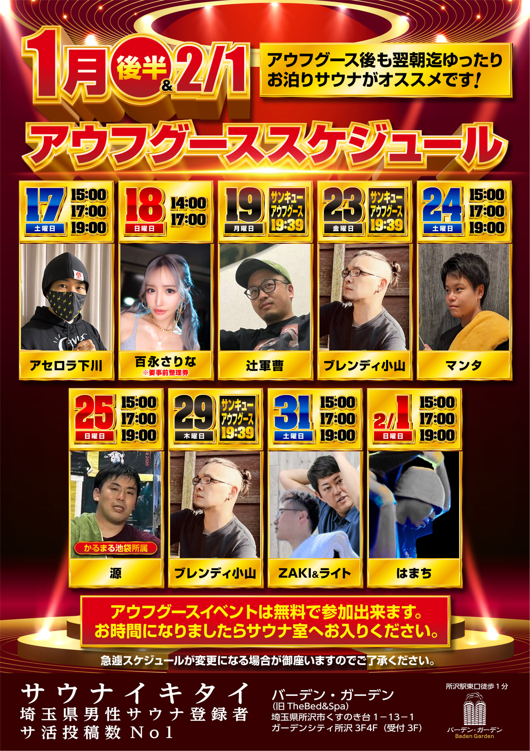 ♨ 1月後半アウフグースイベントスケジュール Posted on 2026年1月7日 by baden258 1月後半アウフグーススケジュールはコチラ❗ 週末&平日サンキューアウフグース開催❗ 1/18(日)は百永さりなさん来店😆 1/25(日)はかるまる池袋様から源さんが参戦✨ 是非お楽しみ下さい🎵